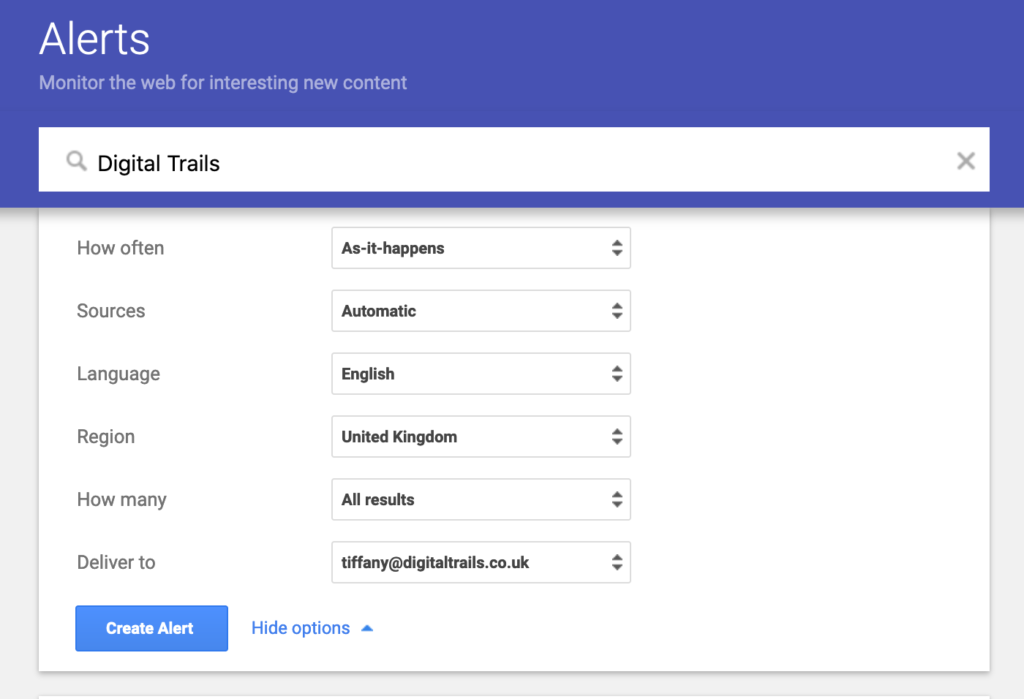Setting up the account is easy (and free!) Just go to google.com/alerts, enter the search term you want to get notified about, click on ‘Show Options’ to narrow your alert to specific geographical areas, languages or sources, then click ‘Create Alert’.