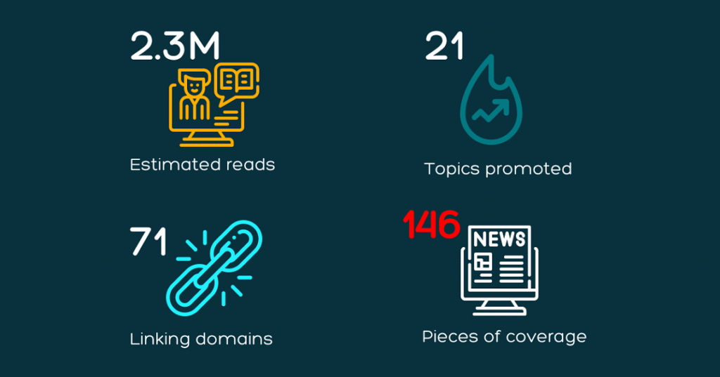 Through integrating the above tactics, we rolled out a 10-month long Performance PR campaign which achieved excellent results, exceeding client KPIs and increasing online visibility and website revenue significantly. Our targeted approach yielded significant results, allowing us to deliver close to 150 pieces of coverage (media mentions in mostly top tier press), which resulted in 2.3 million estimated reads for the articles published and 71 unique linking domains, across various relevant media sectors.